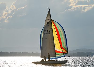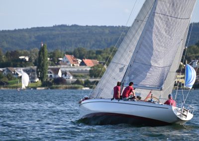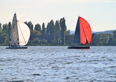 Doch wieder einmal zeigte der Gnadensee seinen eigenen Charakter. Nach einer kurzen Schwachwindphase drehte der Wind auf Ost-Nord-Ost (nun ca. 6-7 kts) und forderte von den Teilnehmer neue taktische Entscheidungen im Einsatz des Vorsegels. Wer ohne Vorsegel unterwegs war, konnte den Anschluss zum Teilnehmerfeld kaum halten und das Starterfeld zog sich dementsprechend in die Länge. Dennoch gelang es 15 Yachten den Kurs bis 20:20 Uhr 2-mal zu umrunden. Die ersten Plätze dieser Wettfahrt sicherten sich die Gäste des YCIR.